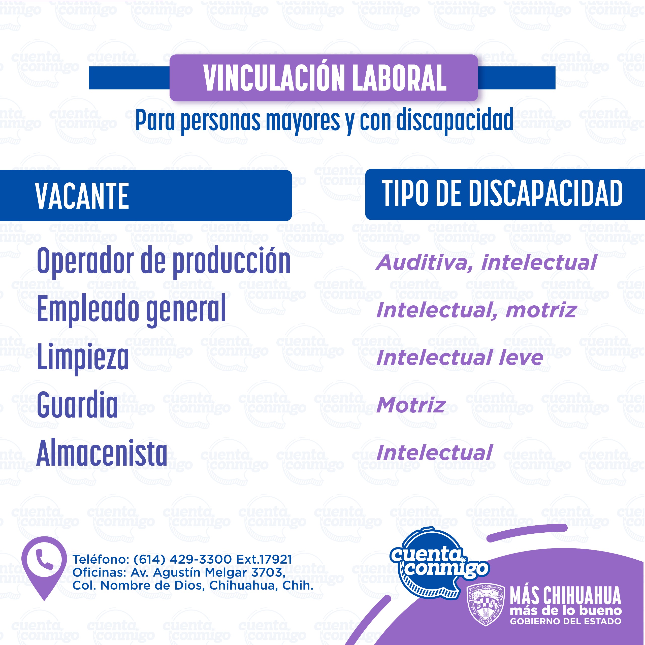 Las personas interesadas en conocer más detalles sobre estas vacantes, comunicarse con el equipo de la Dirección de Grupos Vulnerables, al teléfono (614) 429-33-00, extensión 17921.