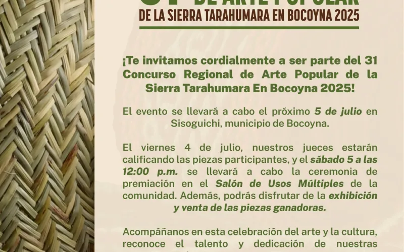 Fomento y Desarrollo Artesanal del Estado de Chihuahua (Fodarch) anunció la realización del 31° Concurso Regional de Arte Popular de la Sierra Tarahumara, cuya ceremonia de premiación se llevará a cabo el 5 de julio en Sisoguichi, municipio de Bocoyna.