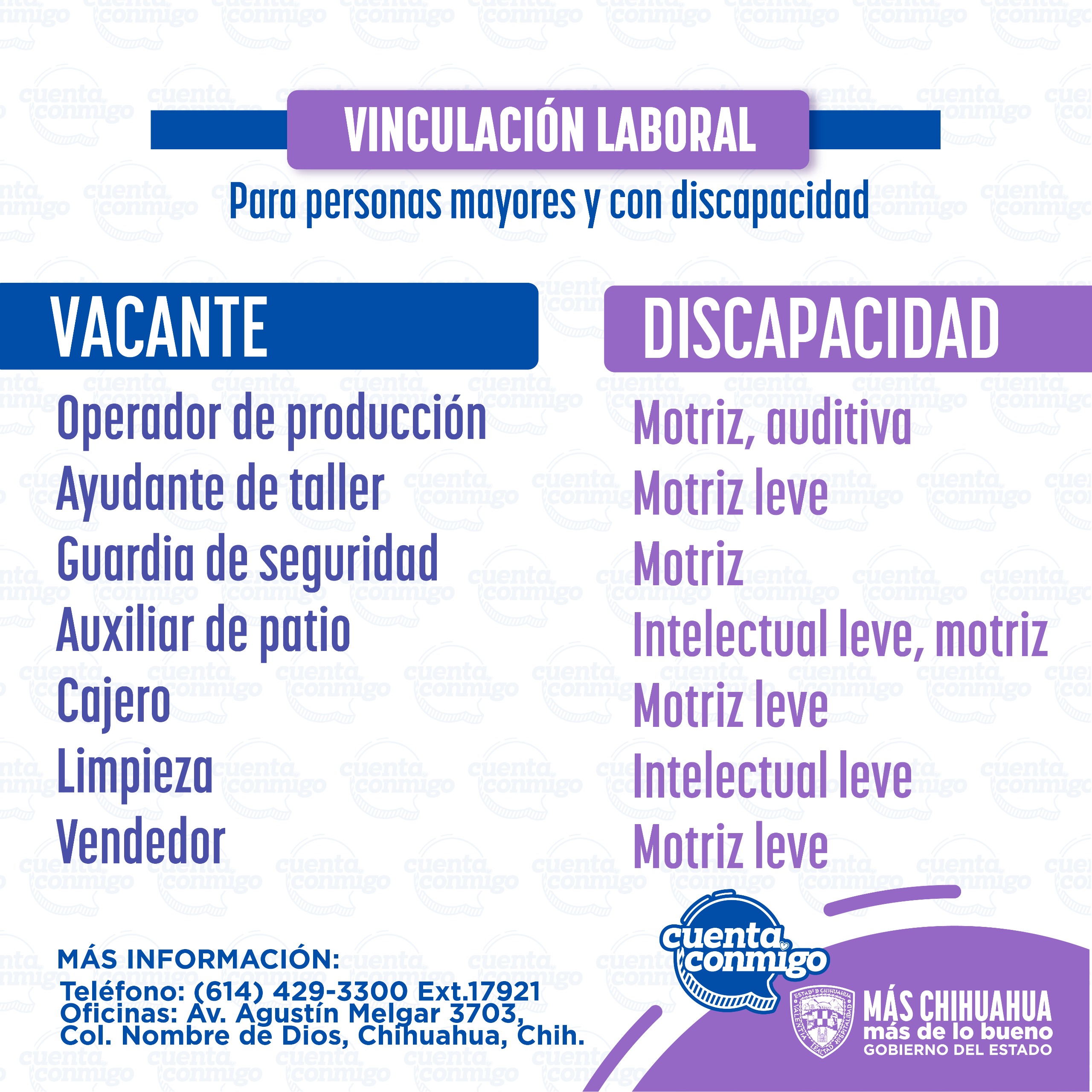 Las personas interesadas pueden comunicarse al teléfono (614) 429-33-00, extensión 17921, para recibir información detallada sobre los requisitos de cada puesto, así como asesoría para facilitar el proceso de vinculación y entrevistas con las empresas participantes.