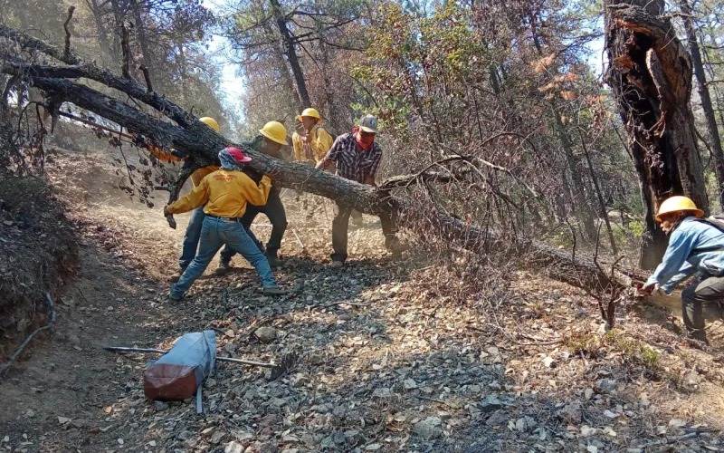 Las labores de combate se realizan de forma coordinada entre brigadas de Conafor y la Secretaría de Desarrollo Rural (SDR), con apoyo permanente de la Secretaría de la Defensa Nacional (SEDENA) y la Coordinación Estatal de Protección Civil (CEPC).