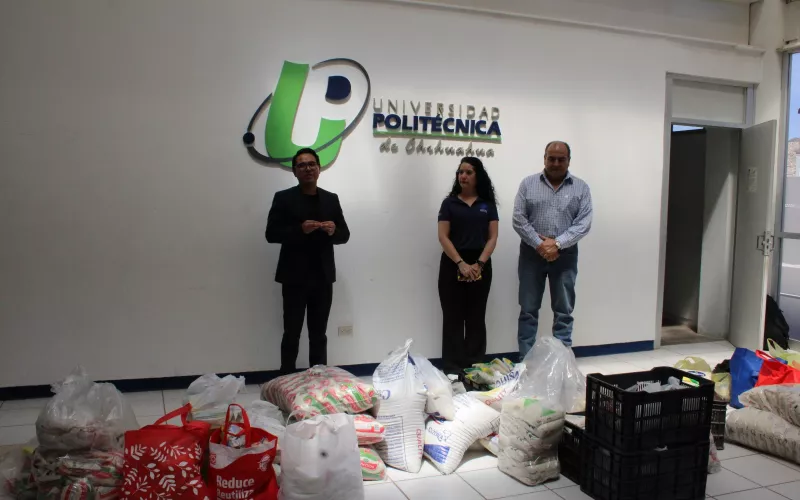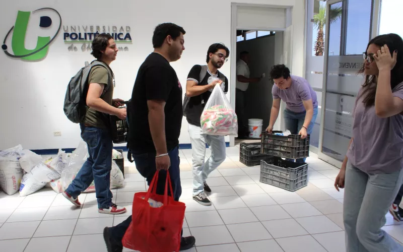 Estudiantes de la Universidad Politécnica de Chihuahua (UPCH) entregaron 830 kilogramos de arroz y frijol para la campaña “Chihuahua Comparte”, de la asociación civil Cáritas de Chihuahua, con lo cual, la institución educativa suma más de dos toneladas de alimentos aportadas a la iniciativa.