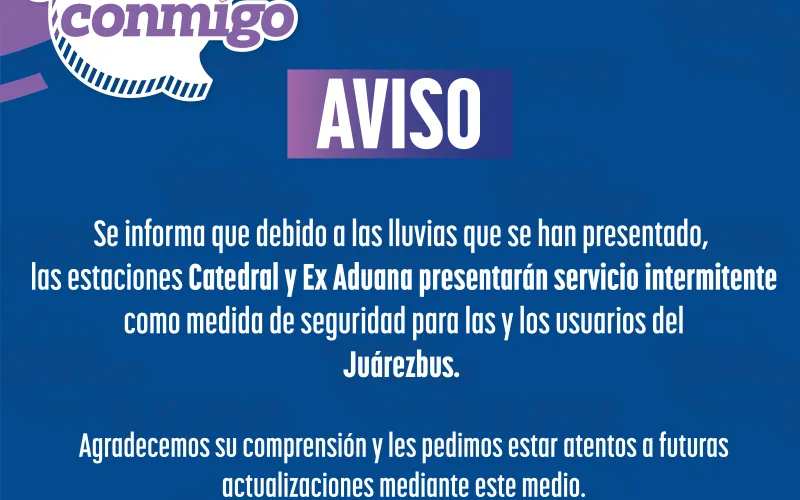 La Secretaría General de Gobierno, a través de la Operadora de Transporte (OTV), informa a las y los usuarios del JuárezBus que, el servicio en las estaciones Catedral y Ex Aduana será intermitente y, por seguridad, permanecerán cerradas temporalmente.