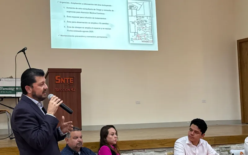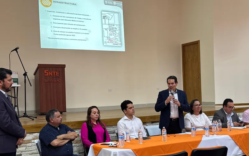 En reunión efectuada en las instalaciones de la Sección 42, se informó la próxima ampliación, equipamiento, y remodelación de las áreas de urgencias y hemodiálisis, la instalación de un elevador accesible para pacientes con discapacidad, así como la adquisición de una ambulancia.