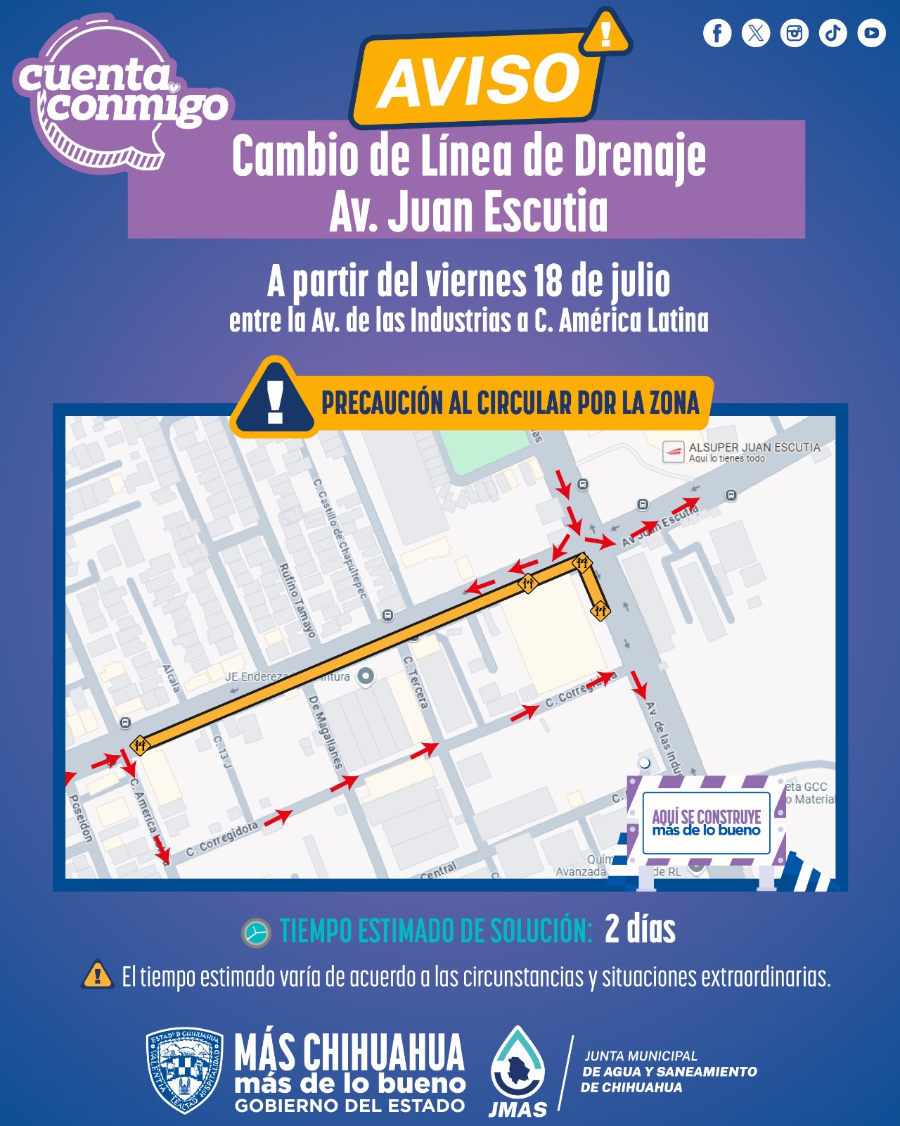 La Junta Municipal de Agua y Saneamiento (JMAS) de Chihuahua informó que este viernes 18 de julio, iniciará los trabajos de cambio de un tramo de línea de drenaje dañada en el cruce de las avenidas Juan Escutia y De las Industrias.