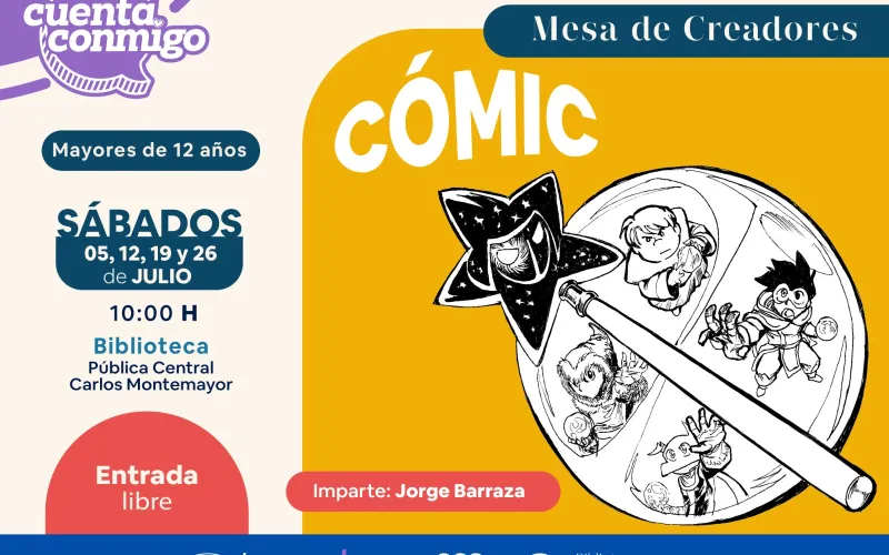 Los días sábado, a las 10 de la mañana, Jorge Barraza dirigirá el taller de elaboración de cómics dirigido a mayores de 12 años, donde los asistentes aprenderán a crear su propio cómic a través del aprendizaje de técnicas de dibujo, narración y creación de personajes.