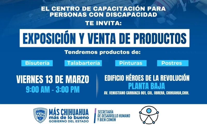 El Gobierno del Estado, a través de la Secretaría de Desarrollo Humano y Bien Común, invita este viernes 13 de marzo a la exposición y venta anual de productos elaborados por usuarios del Centro de Capacitación para Personas con Discapacidad.