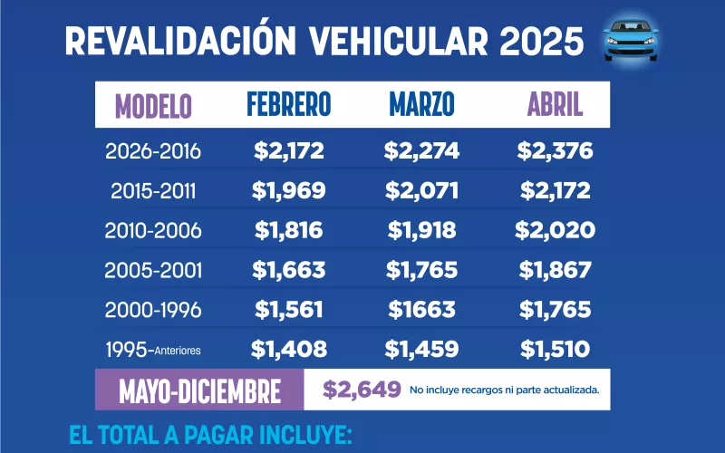 Durante el mes de abril, las y los contribuyentes propietarios de vehículos, cuyos modelos oscilan entre 2016 y 2025, deberán pagar 2 mil 376 pesos; de 2011 a 2015 son 2 mil 172 pesos y de 2006 a 2010 pagarán 2 mil 020 pesos.