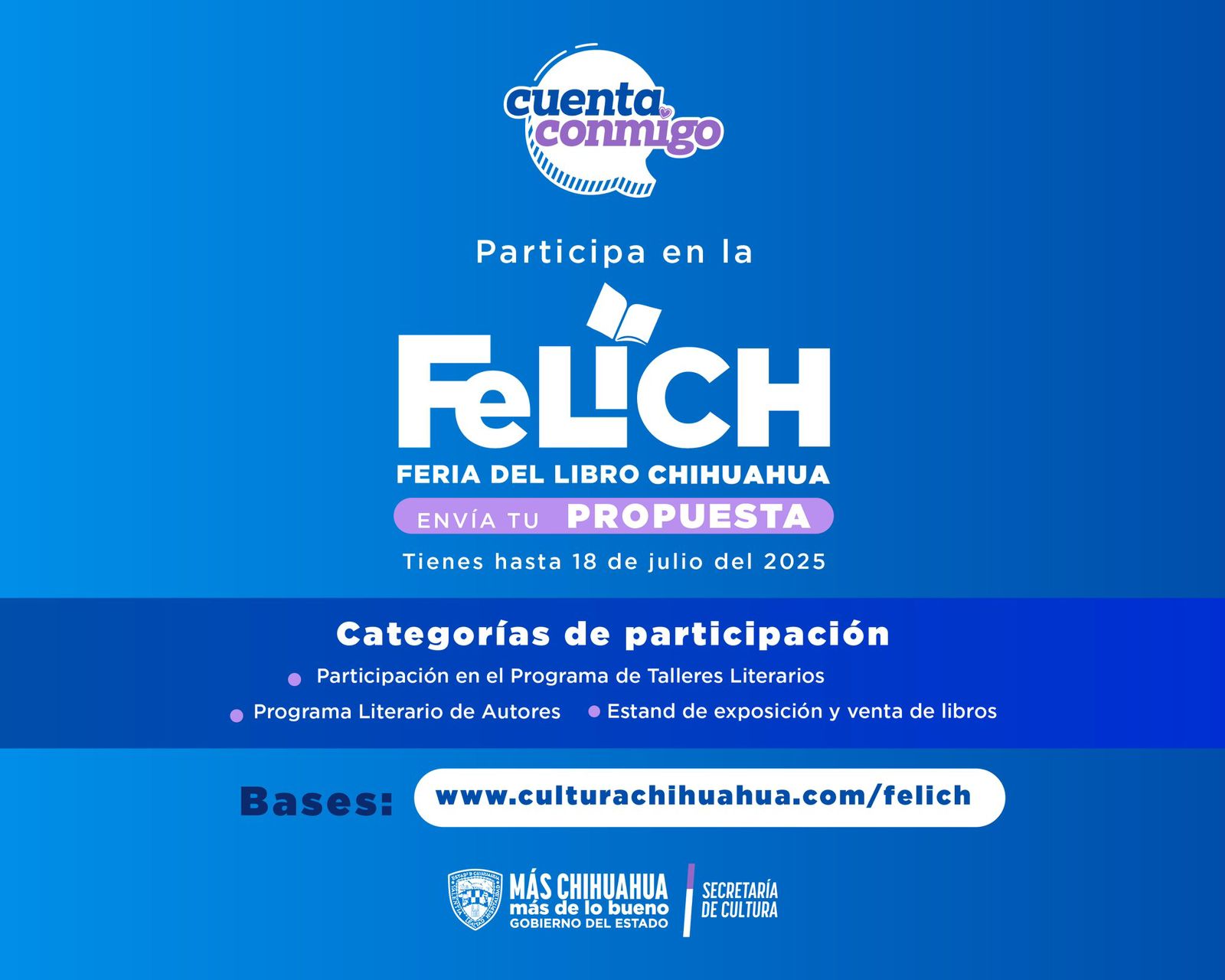 Las bases se encuentran disponibles en el siguiente link: http://tiny.cc/formularioFELICH2025, la convocatoria se encuentra disponible en https://www.culturachihuahua.com/felich.