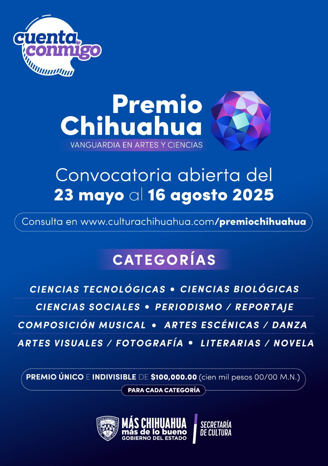 La Secretaría de Cultura invita a participar en la convocatoria del Premio Chihuahua, Vanguardia en Artes y Ciencias 2025, que otorga un estímulo de 100 mil pesos en las categorías de Ciencias Sociales, Ciencias Biológicas, Ciencias Tecnológicas, Literatura, Artes Visuales, Música, Periodismo y Artes Escénicas.