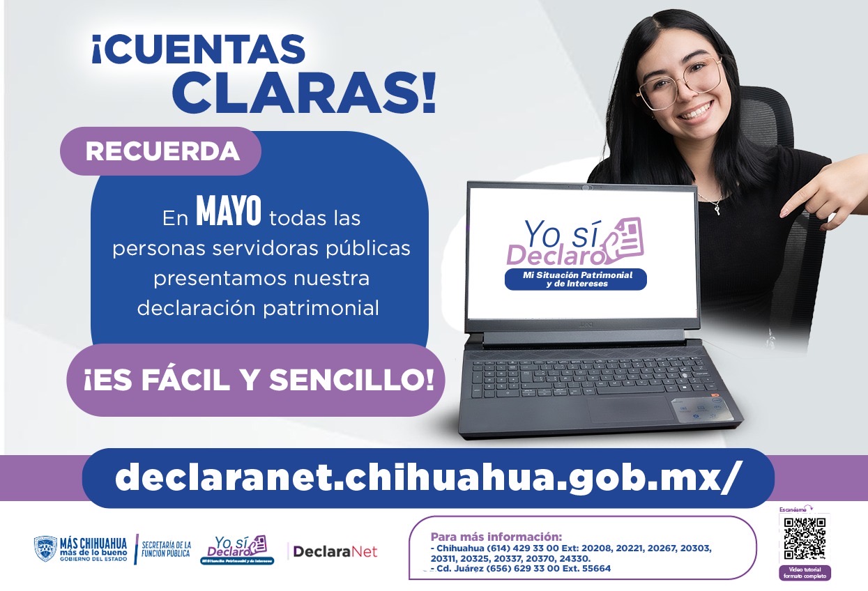 Este procedimiento es clave para fortalecer la transparencia, la integridad y la confianza ciudadana en las instituciones públicas, ejercicio que debe realizarse durante el mes de mayo a través de la plataforma: https://declaranet.chihuahua.gob.mx.