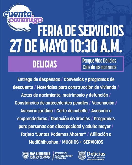 La Secretaría de Desarrollo Humano y Bien Común (SDHyBC) invita a las familias del municipio de Delicias a aprovechar la Feria de Servicios “Cuenta Conmigo”, que se realizará este martes 27 de mayo con el fin de atender las necesidades de la población.