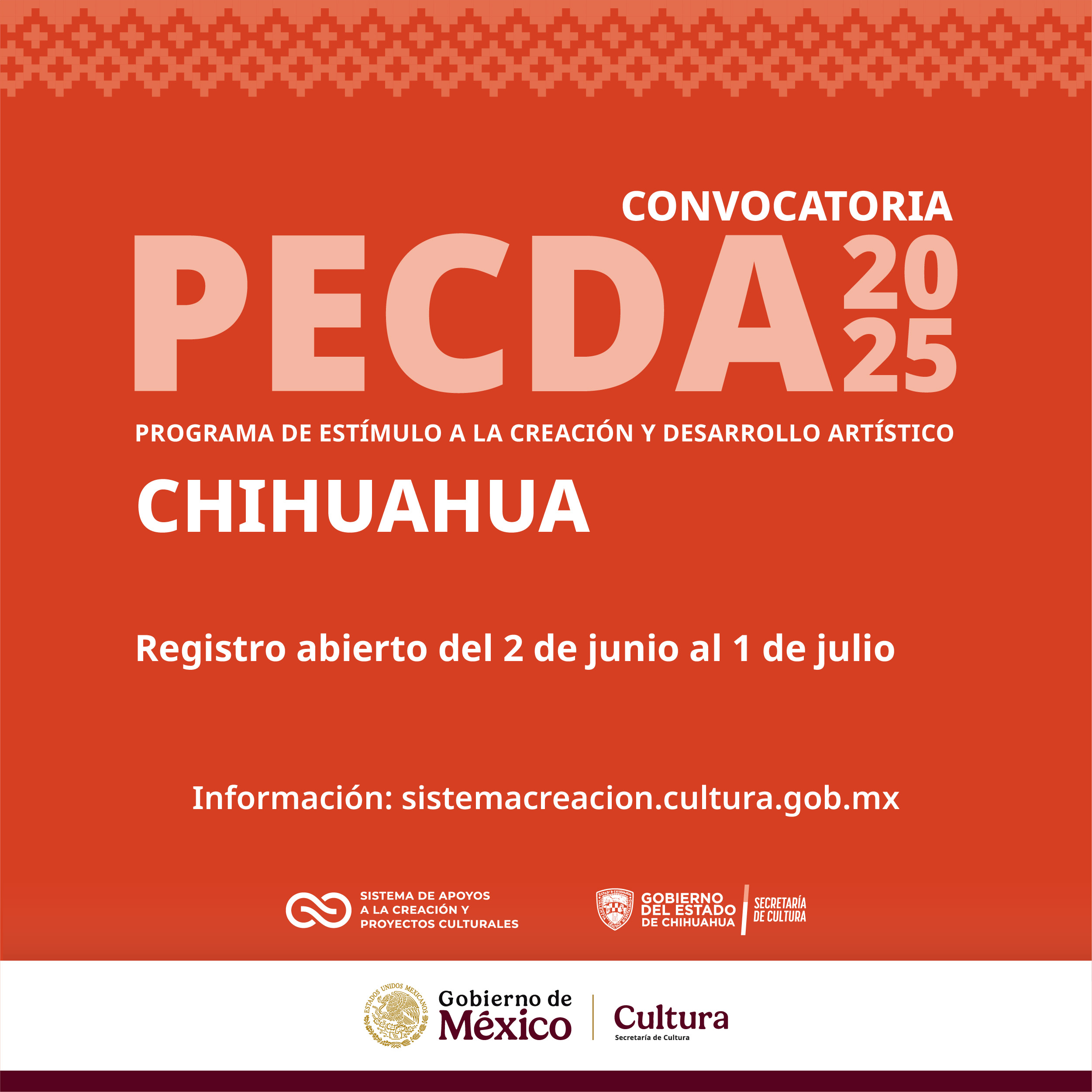 La Secretaría de Cultura del Gobierno de México, a través del Sistema de Apoyos a la Creación y Proyectos Culturales, en coordinación con el Gobierno del Estado, invita a la comunidad artística a participar en la convocatoria 2025 del Programa de Estímulo a la Creación y Desarrollo Artístico (PECDA) Chihuahua.
