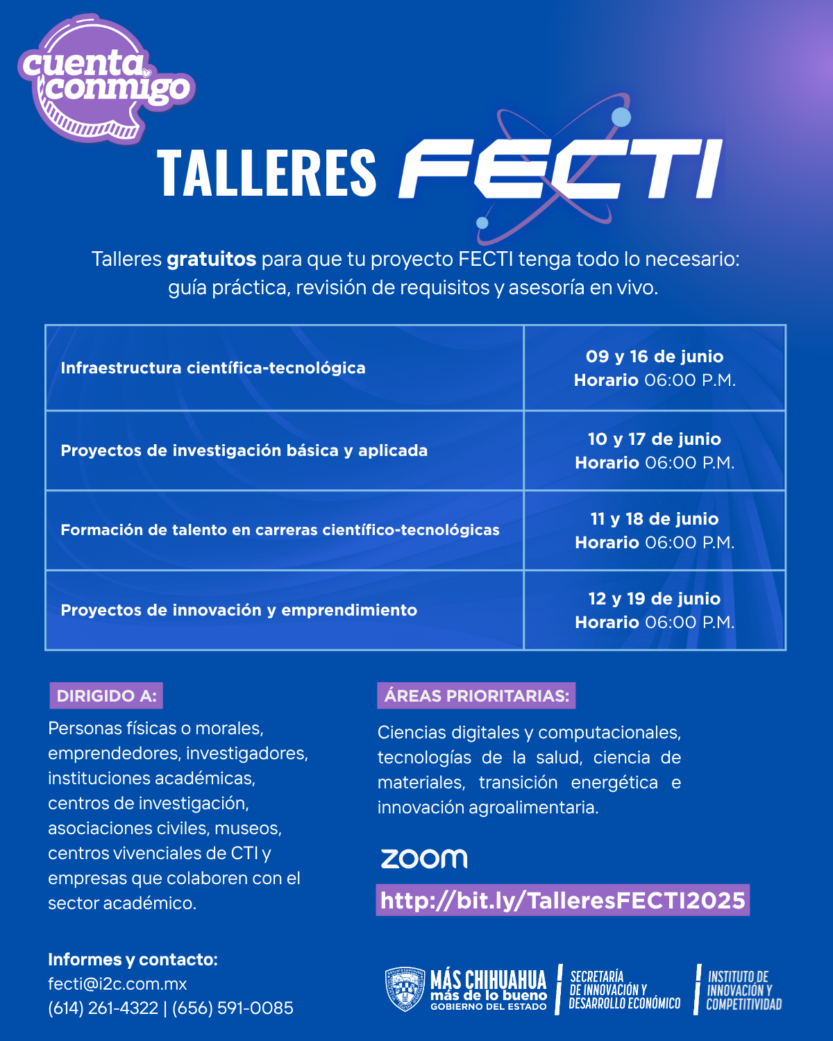 Las personas interesadas pueden comunicarse al correo fecti@i2c.com.mx, o llamar a los teléfonos (614) 261-43-22 en Chihuahua y (656) 591-00-85 en Ciudad Juárez.