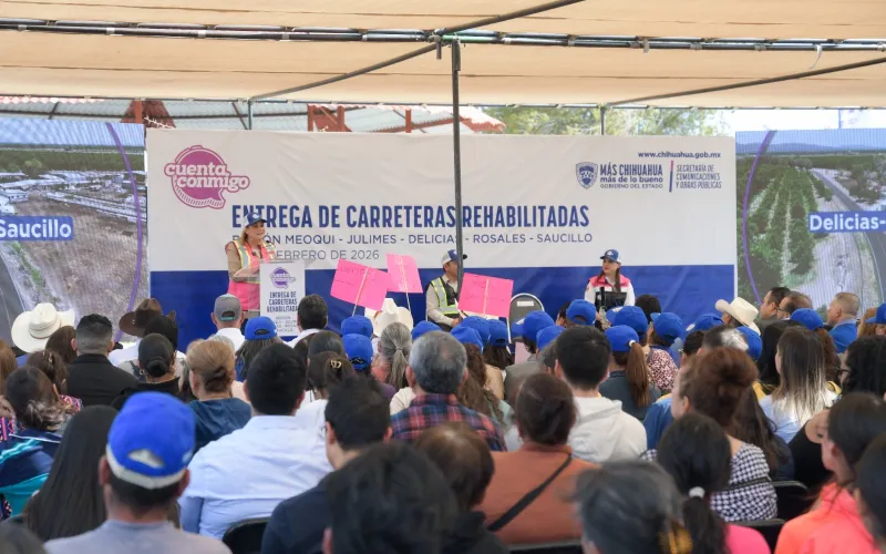 La gobernadora Maru Campos entregó la obra de rehabilitación de la carretera Meoqui-Julimes que beneficiará a más de 50 mil personas, y que, en conjunto con la reconstrucción de la vía a Rosales y el acceso al seccional de Lázaro Cárdenas, representa una inversión superior a los 100 millones de pesos (mdp).