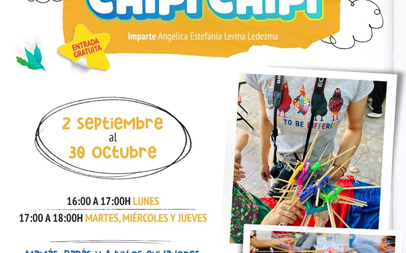 Finalmente, para madres, padres y adultos y creadores, se contará con el taller “Chipi Chipi” desde el 2 de septiembre al 30 de octubre con sesiones los días lunes de 4 a 5 de la tarde y martes, miércoles y jueves de 17:00 a 18:00 horas. Los mayores podrán disfrutar de danza, narraciones e instalaciones de juego.