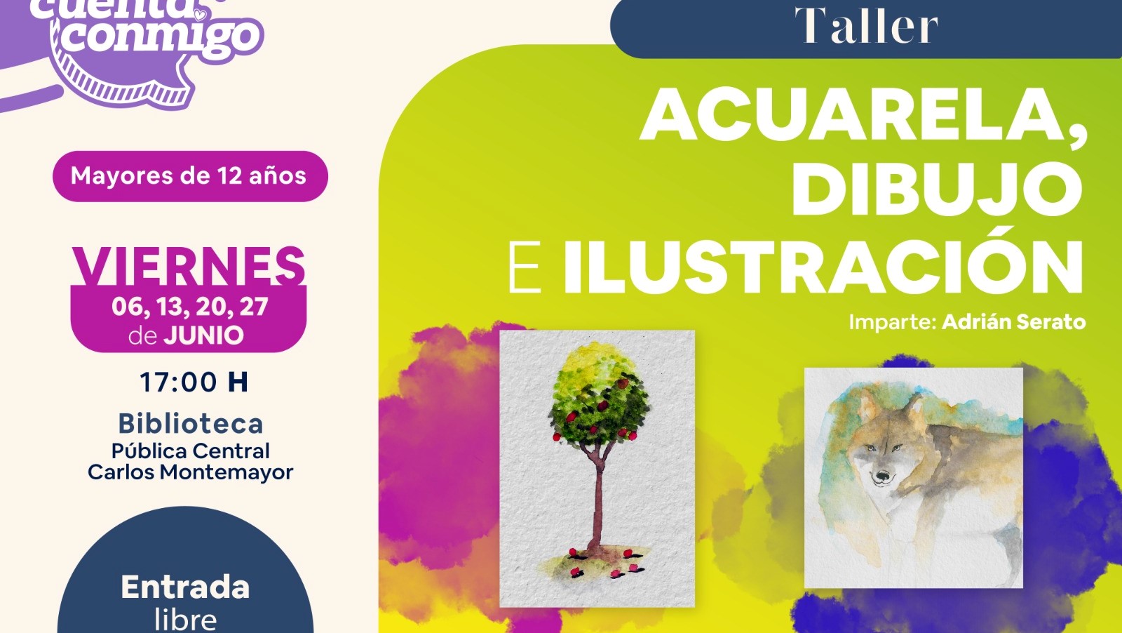 El Taller de Acuarela, Dibujo e Ilustración se impartirá todos los viernes de junio a las 17:00 horas, por el artista Adrián Serato, dirigido a personas mayores de 12 años, interesadas en explorar técnicas de expresión visual mediante la pintura y el dibujo.