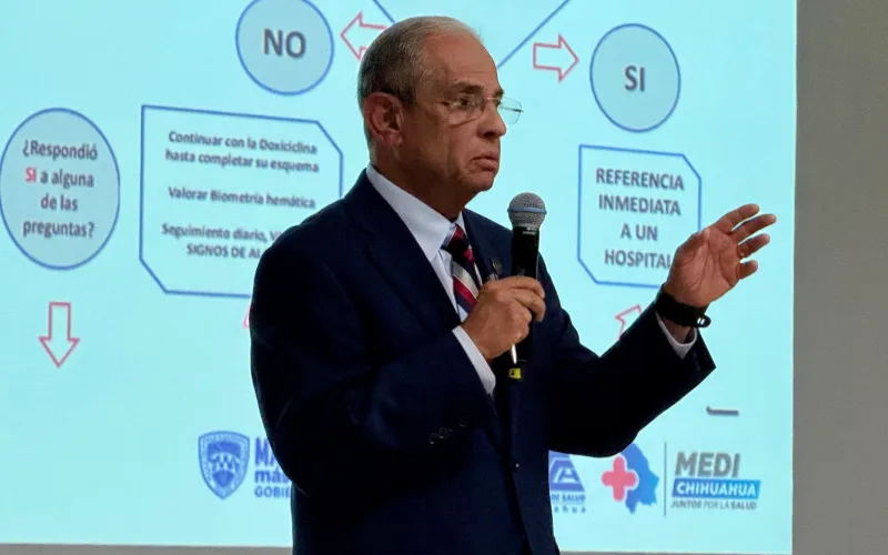 El director del Distrito de Salud II Juárez, Rogelio Covarrubias, realizó una ponencia titulada “Panorama Epidemiológico de la Rickettsia”, donde abordó los casos presentados y edades afectadas en Ciudad Juárez.