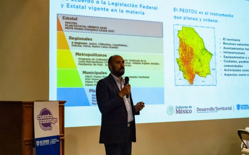 El funcionario afirmó que gracias a la correcta visión de gobernanza de Maru Campos, el estado se nutre y crece en los temas de ordenamiento territorial y desarrollo urbano, y expuso como ejemplo, que la entidad no contaba desde 1998 con una herramienta como será el próximo Plan Estatal de Ordenamiento Territorial, y que desde 1995 a la fecha, el ordenamiento legal había carecido de su reglamento.