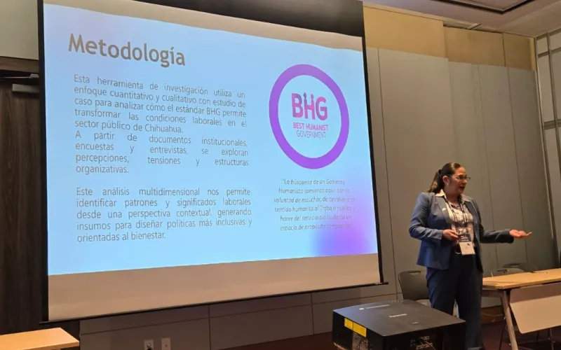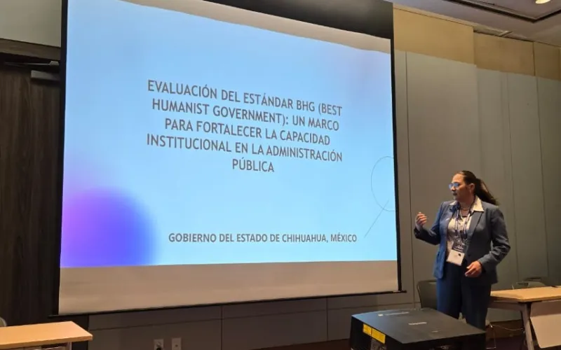 La maestra Norma Leticia Enderi González, destacó con la ponencia “Evaluación del estándar BHG (Best Humanist Government): Un marco para fortalecer la capacidad institucional en la administración pública”, investigación enmarcada en la administración del Gobierno del Estado de Chihuahua.