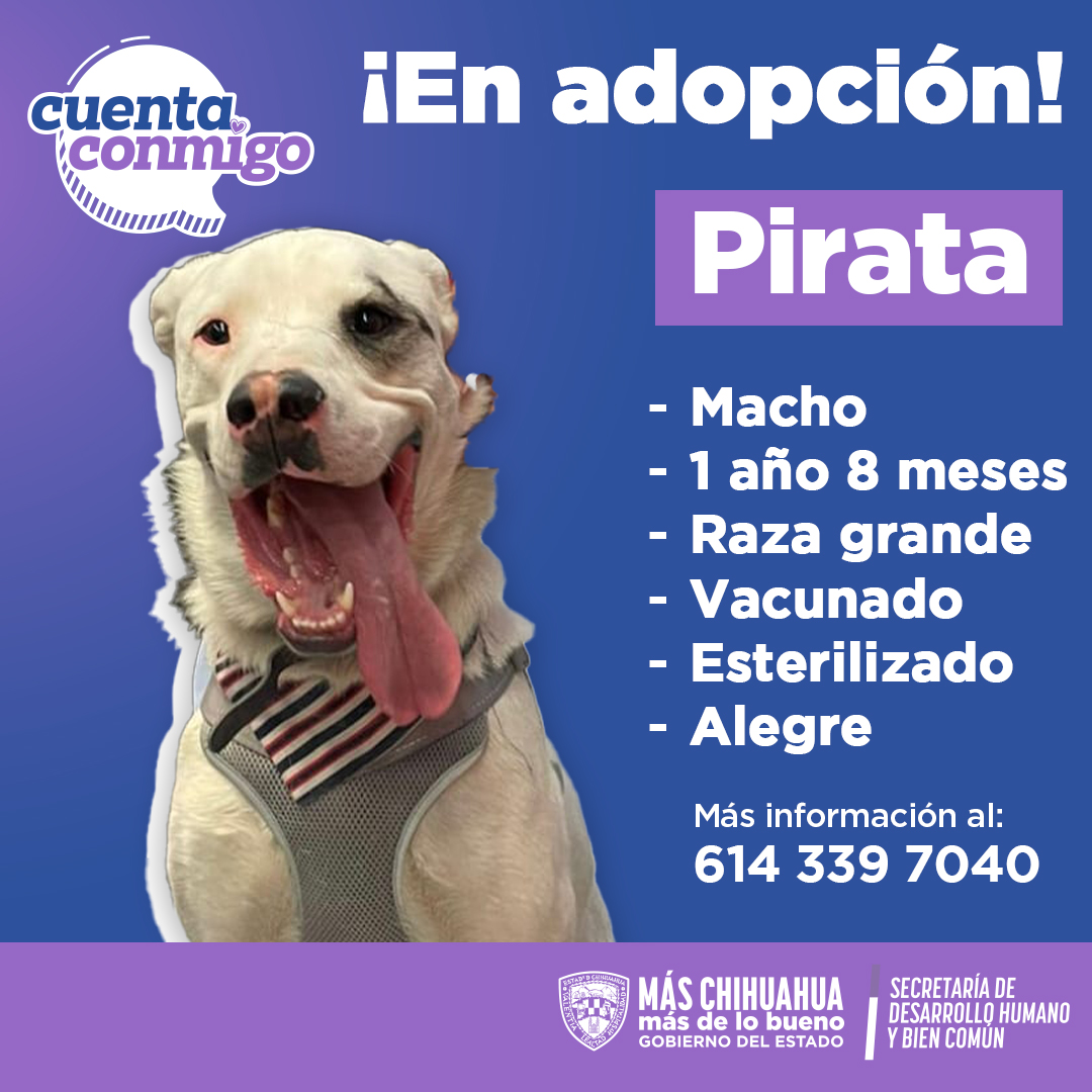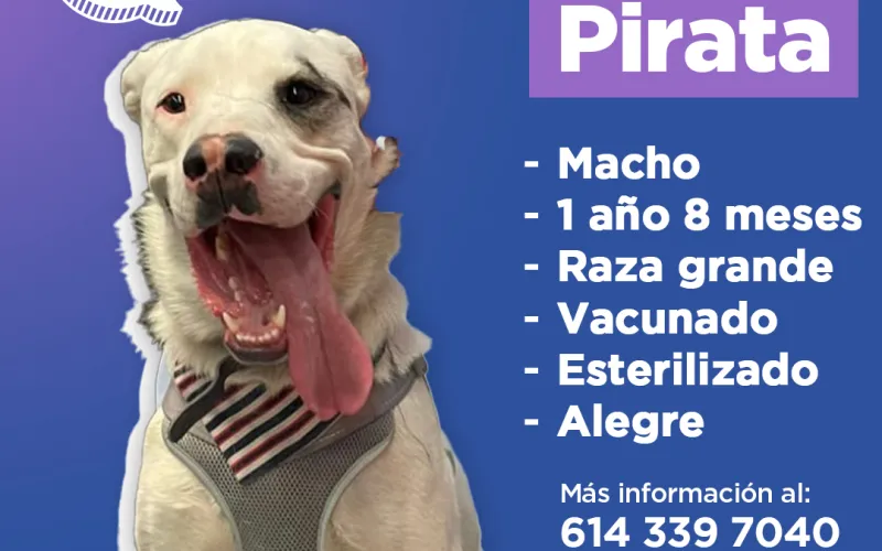 Entre los casos destacados está el de “Pirata”, un perro mestizo de 1 año 8 meses, de tamaño grande, alegre, vacunado y esterilizado, que busca una familia que le brinde amor y cuidado.