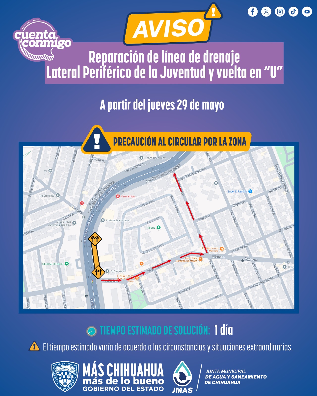 Este jueves 29 de mayo, la Junta Municipal de Agua y Saneamiento (JMAS) de Chihuahua inicia la reparación de un tramo de línea de desagüe, que se localiza en la lateral del periférico de la Juventud, a la altura del cruce con calle Egipto, en sentido sur-norte.