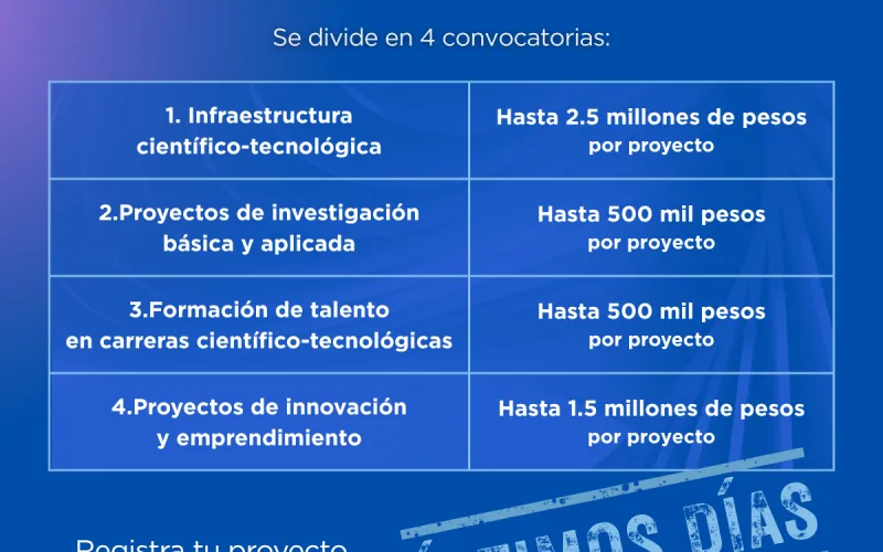 - Infraestructura Científica y Tecnológica, dirigida a proyectos que busquen crear, adquirir o fortalecer infraestructura en centros de investigación, instituciones educativas o empresas que trabajen en ciencia, tecnología e innovación.