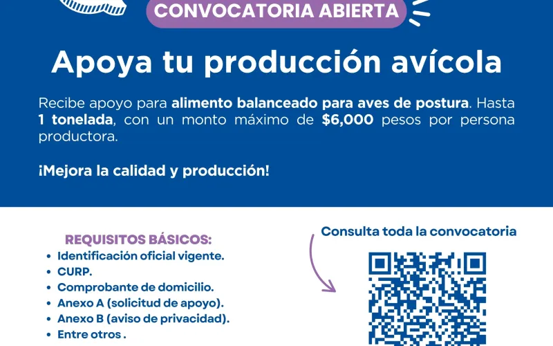 La Secretaría de Desarrollo Rural (SDR) abrió por primera vez la convocatoria para el otorgamiento de apoyo y subsidio de alimento balanceado, dirigido a productores de aves de postura o gallinas ponedoras.