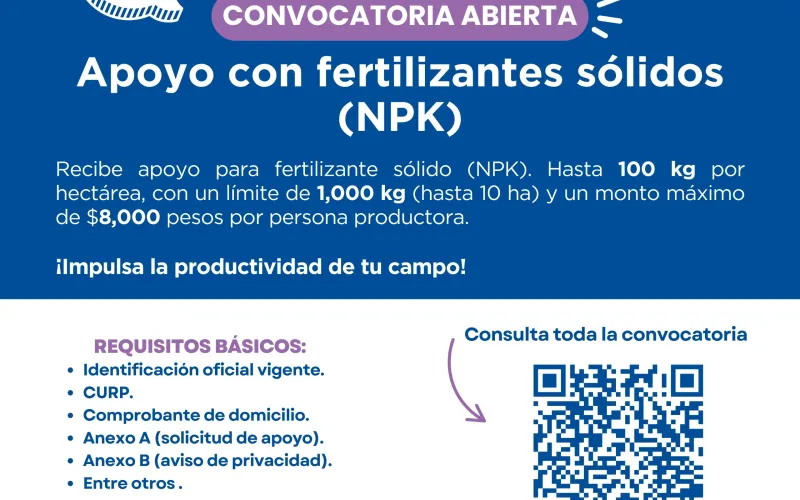 Abre SDR convocatoria para apoyo en fertilizantes sólidos NPK: Nitrógeno, Fósforo y Potasio