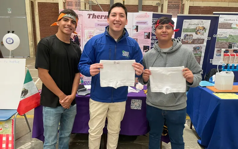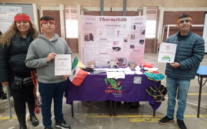 Jesús Alexis y José Gael acompañados de su asesora María Eugenia Delgado Casale, presentaron el proyecto ThermiSilk “Abraza el calor, olvida el dolor”, una prenda terapéutica diseñada para aliviar dolores lumbares y menstruales.