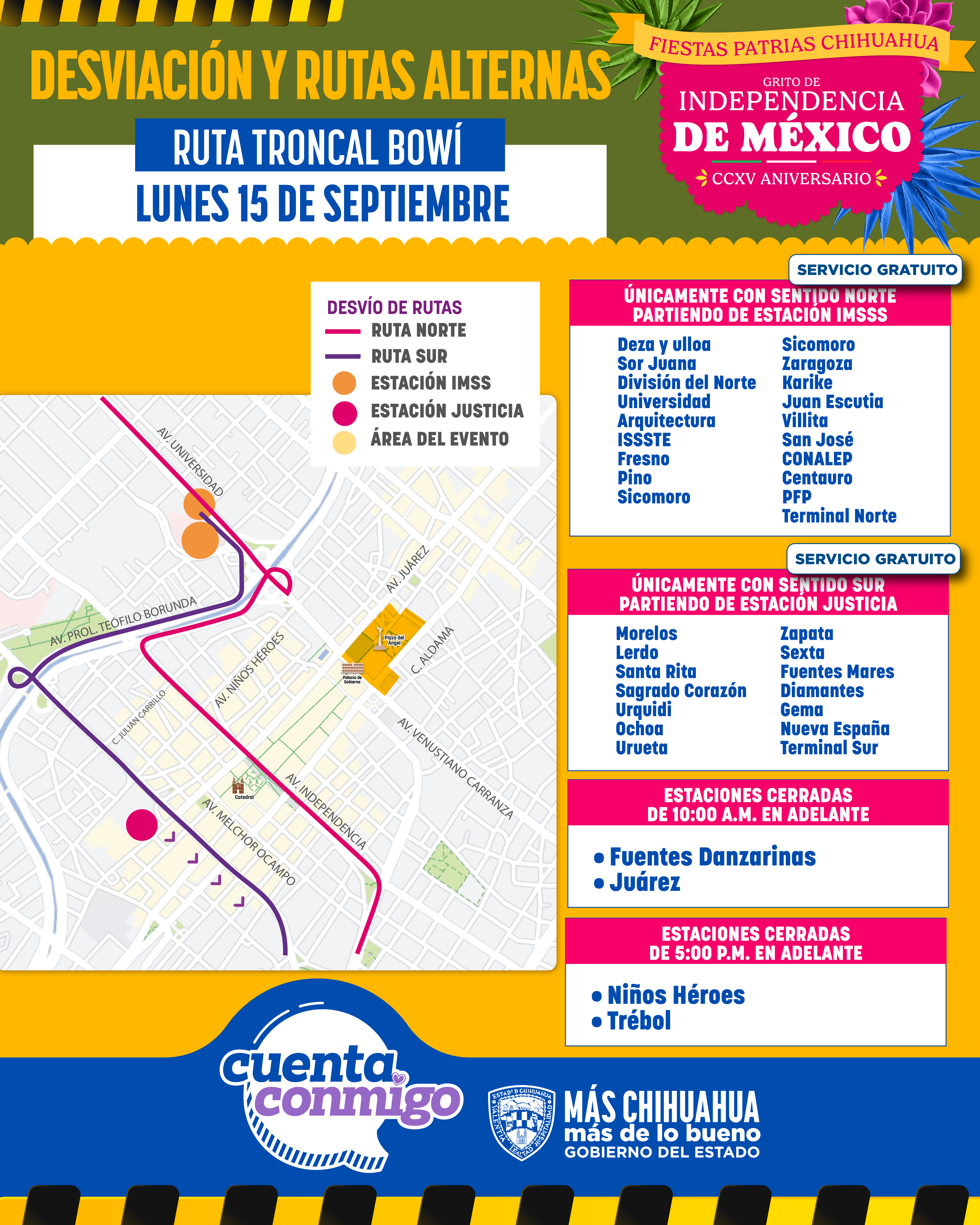 Se invita a la ciudadanía a tomar sus precauciones y hacer uso del Bowí para acudir a la Plaza del Ángel y disfrutar de las fiestas patrias, que serán encabezadas por la gobernadora Maru Campos.