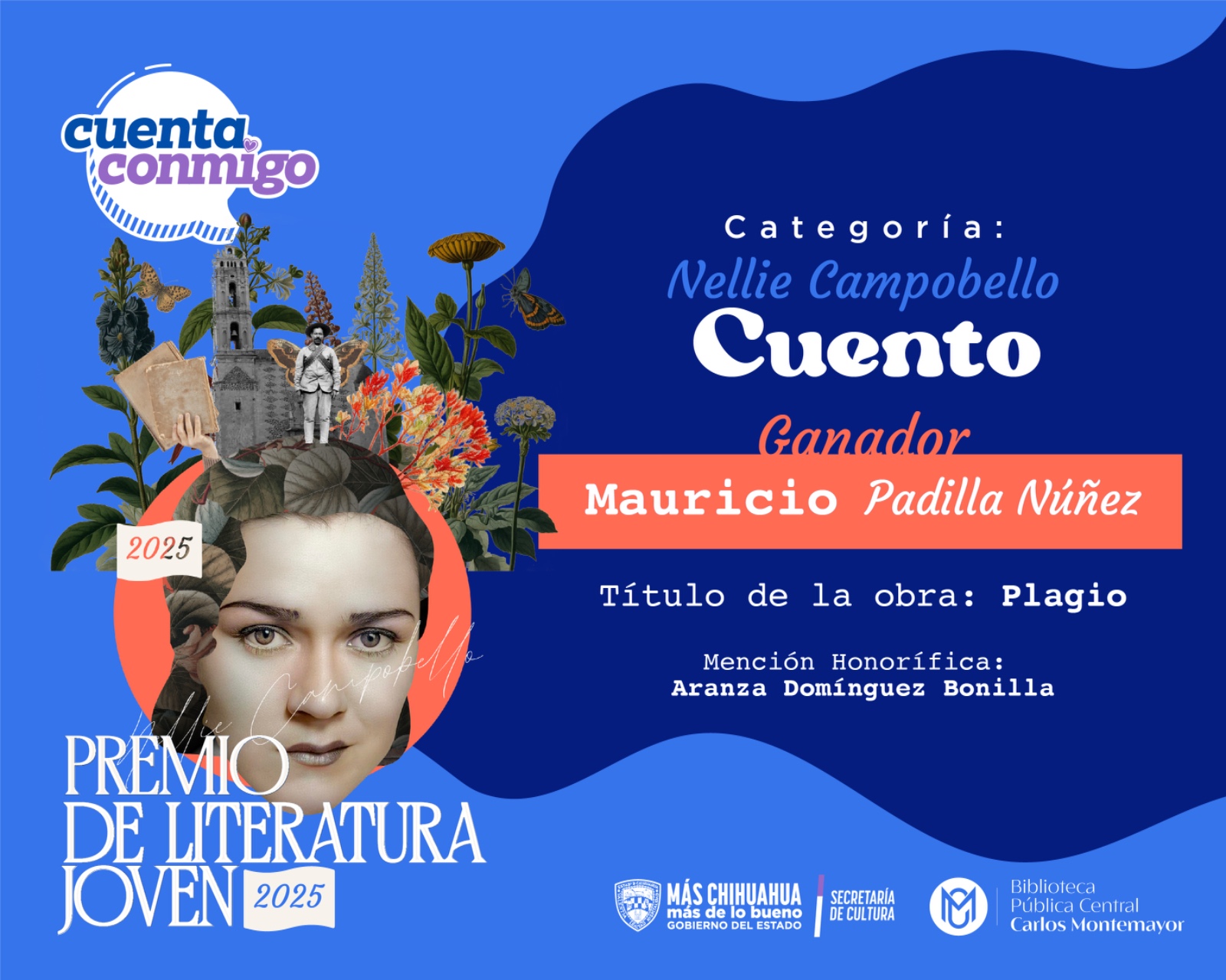 Para el premio “Nellie Campobello” de Cuento, se otorgó a Mauricio Padilla Núñez, por su obra “Plagio” con Aranza Domínguez Bonilla como mención honorífica.
