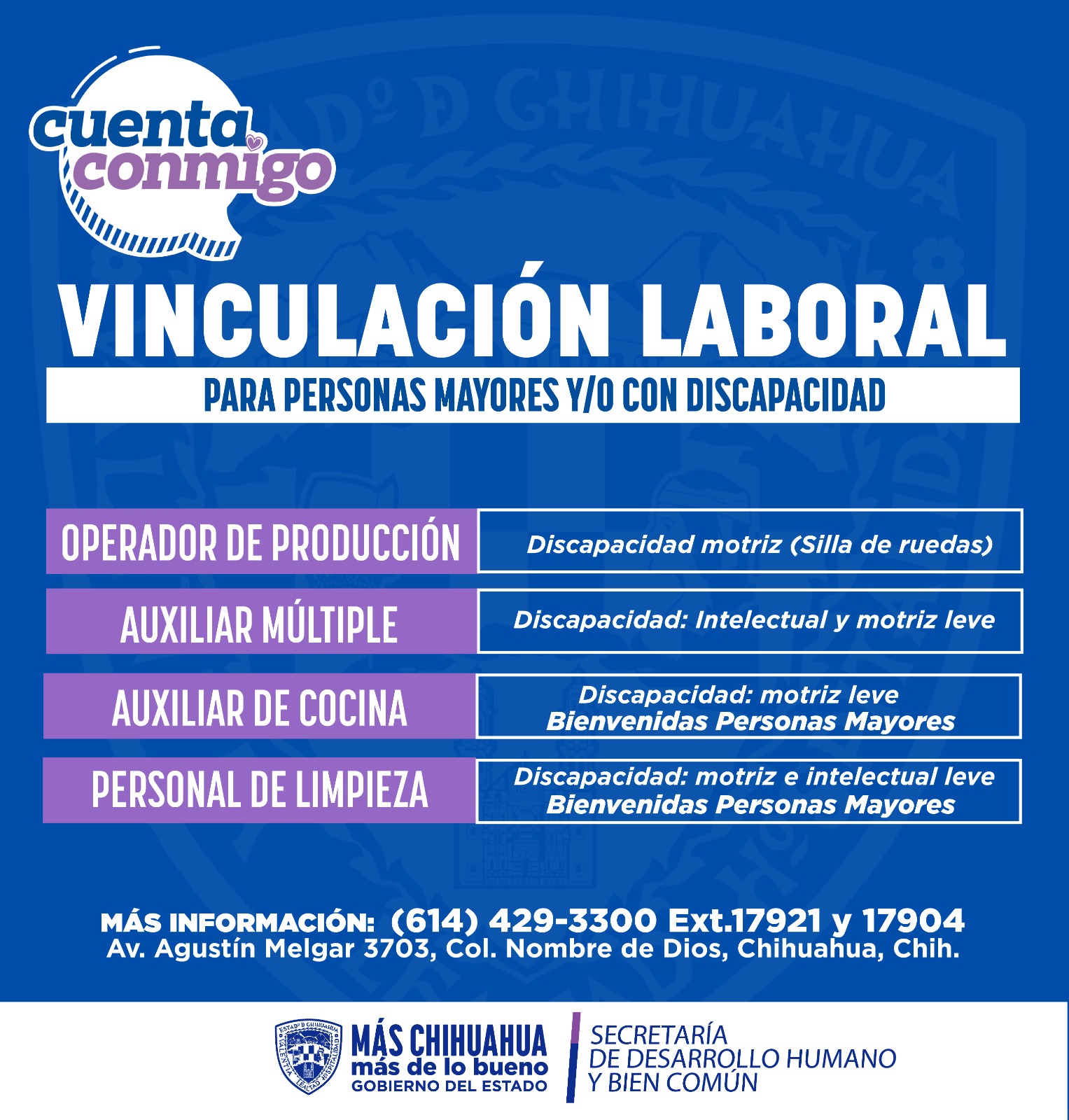 Invitó a las personas interesadas en conocer más detalles sobre estas y más vacantes, a comunicarse a la Dirección de Grupos Vulnerables al teléfono (614) 429-33-00, extensión 17921 y 17904.