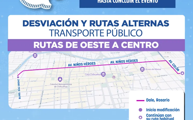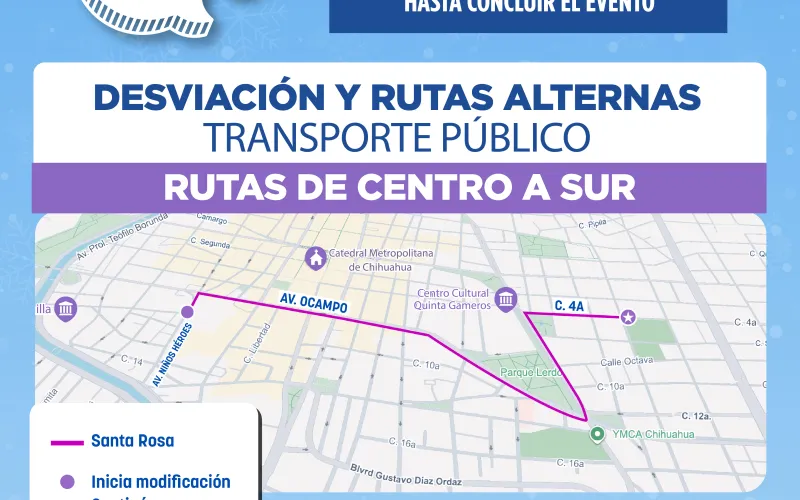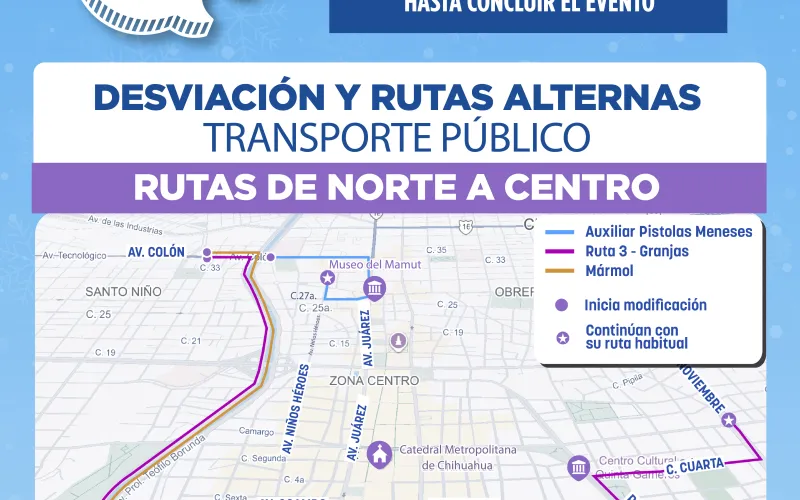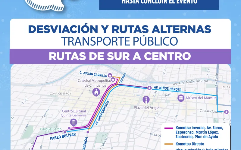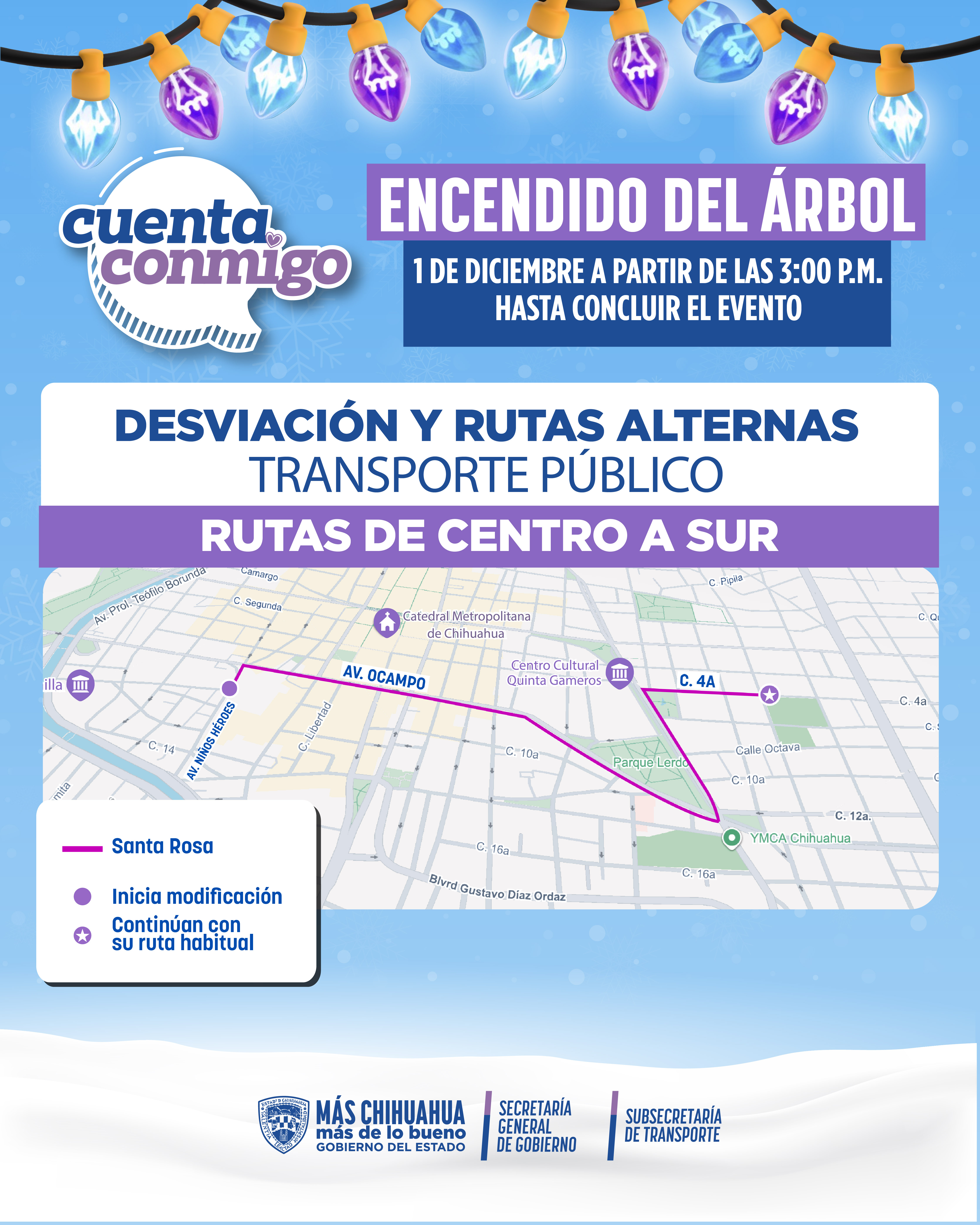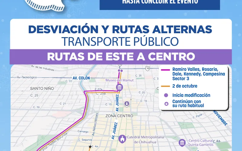 La Secretaría General de Gobierno, a través de la Subsecretaría de Transporte, informa las modificaciones temporales que ocurrirán en distintas rutas con motivo del tradicional Encendido del Árbol Navideño 2025, este 1 de diciembre, cuando se cerrarán las avenidas principales del primer cuadro de la ciudad.
