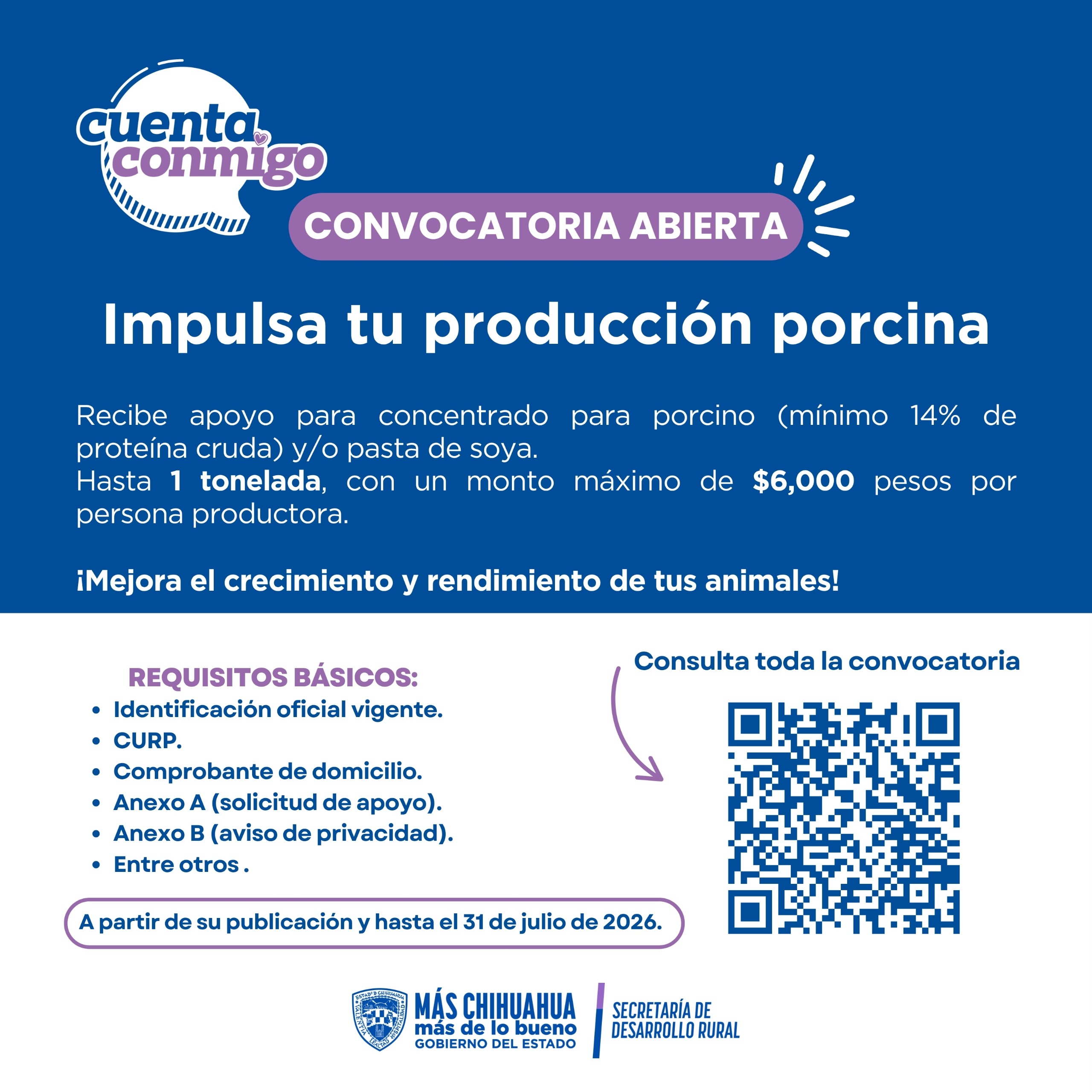 La Secretaría de Desarrollo Rural (SDR) informó que, como parte de las convocatorias del programa “Cuenta Conmigo en el Campo”, por primera vez se pone a disposición el esquema para la adquisición de concentrado alimenticio para porcino, con un mínimo de 14 por ciento de proteína cruda y/o pasta de soya.