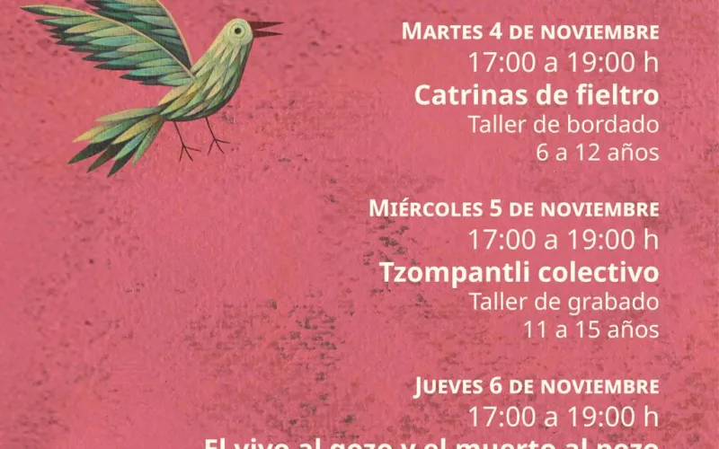 La agenda continúa el jueves 6 de noviembre con el taller de huerto “El vivo al gozo y el muerto al pozo” de 17 a 19 horas, orientado a niñas y niños de 6 a 12 años. Finalmente, en el mismo horario, el viernes 7 de noviembre se invita a la narración oral infantil “Calaveritas y rimas del más allá”.