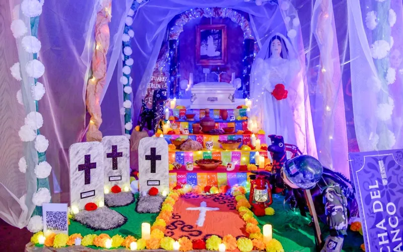 Las ofrendas incluyen elementos característicos de esta tradición como flores de cempasúchil, papel picado, veladoras, fotografías, alimentos y objetos alusivos a los personajes conmemorados.