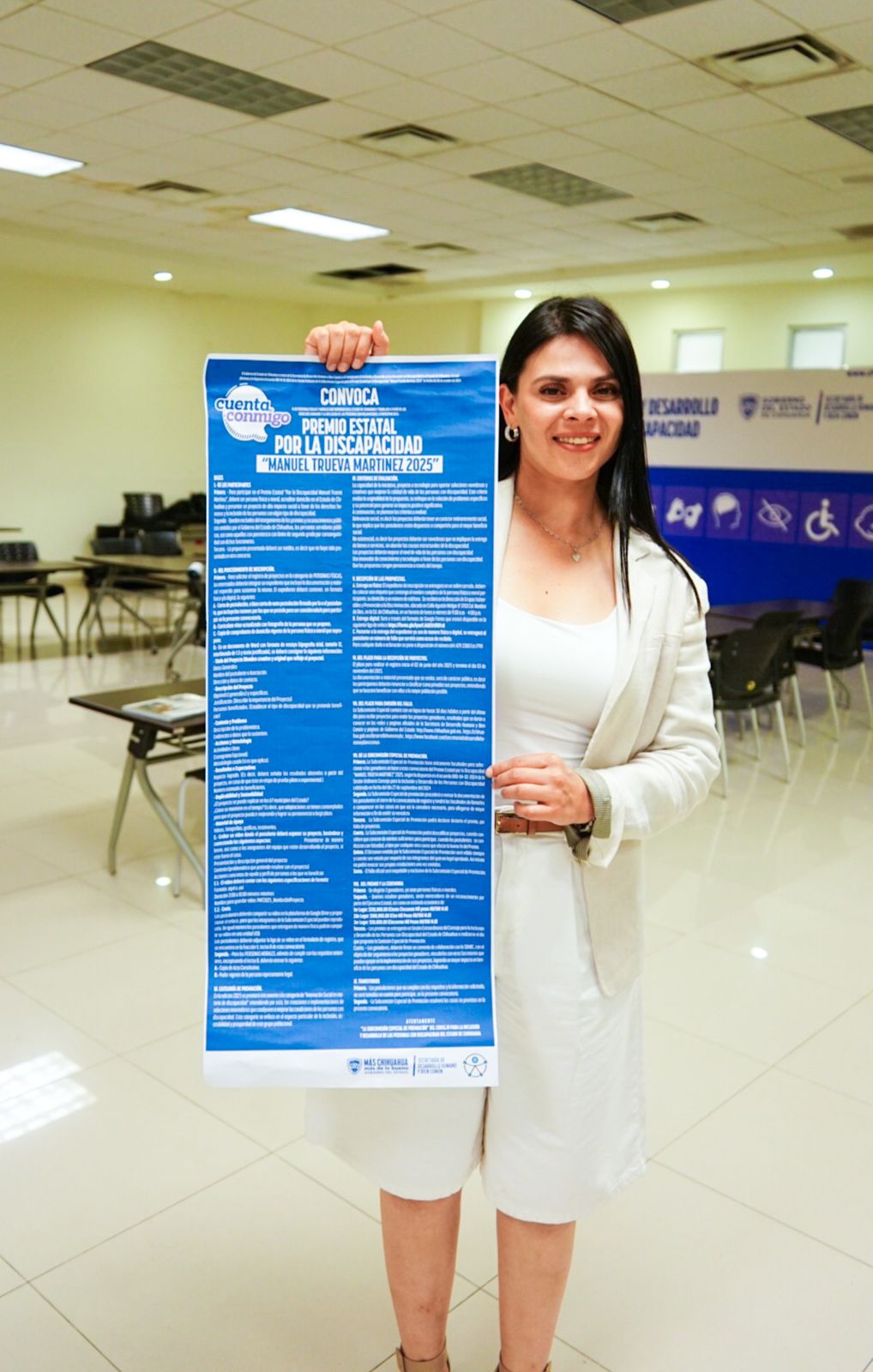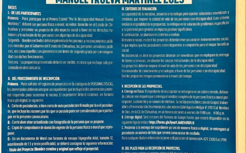 Para más información, acudir a las oficinas de la Secretaría de Desarrollo Humano y Bien Común, ubicadas en el Parque Central Poniente, o consultar la convocatoria completa en el siguiente enlace: https://sdhybc.chihuahua.gob.mx/portal/convocatorias/dgvypd/2025_Convocatoria-Premio-Estatal-por-la-Discapacidad-Manuel-Trueva-Martinez.pdf