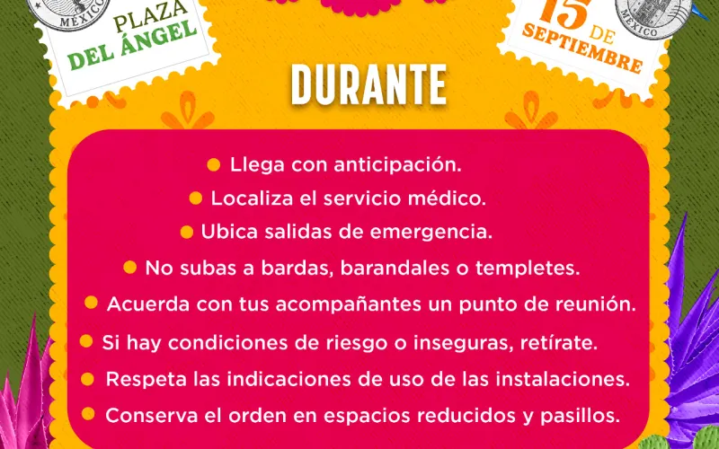 Además, se solicita evitar traer sombrillas puntiagudas, mochilas voluminosas, objetos punzocortantes, encendedores, cerillos o cualquier artículo que represente un riesgo, así como mantener cargado el teléfono celular y establecer un punto de reunión con familiares o amigos en caso de separación.