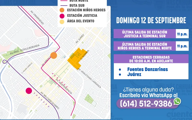 La Secretaría General de Gobierno, a través de la Operadora de Transporte (OTV), informa a las y los usuarios del sistema Bowí que, con motivo del cierre del Festival Internacional de la Ciudad de Chihuahua (FICUU) 2025, este domingo 12 de octubre el servicio extenderá su horario de operación.