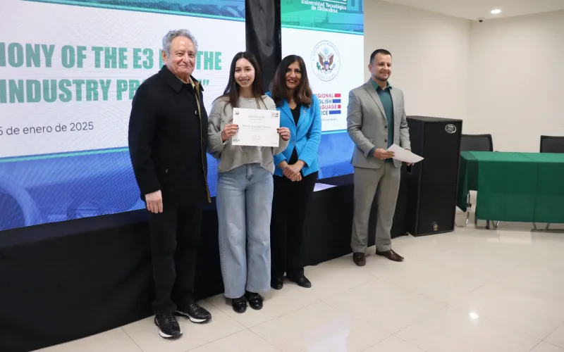 La Universidad Tecnológica de Chihuahua (UTCH) clausuró el Curso de Inglés Técnico para la Industria Aeronáutica, conocido como Programa E3 (Ética, Ingeniería y Empleabilidad), que reunió a estudiantes, docentes, autoridades universitarias, representantes de la Embajada de Estados Unidos y personal del sector industrial.