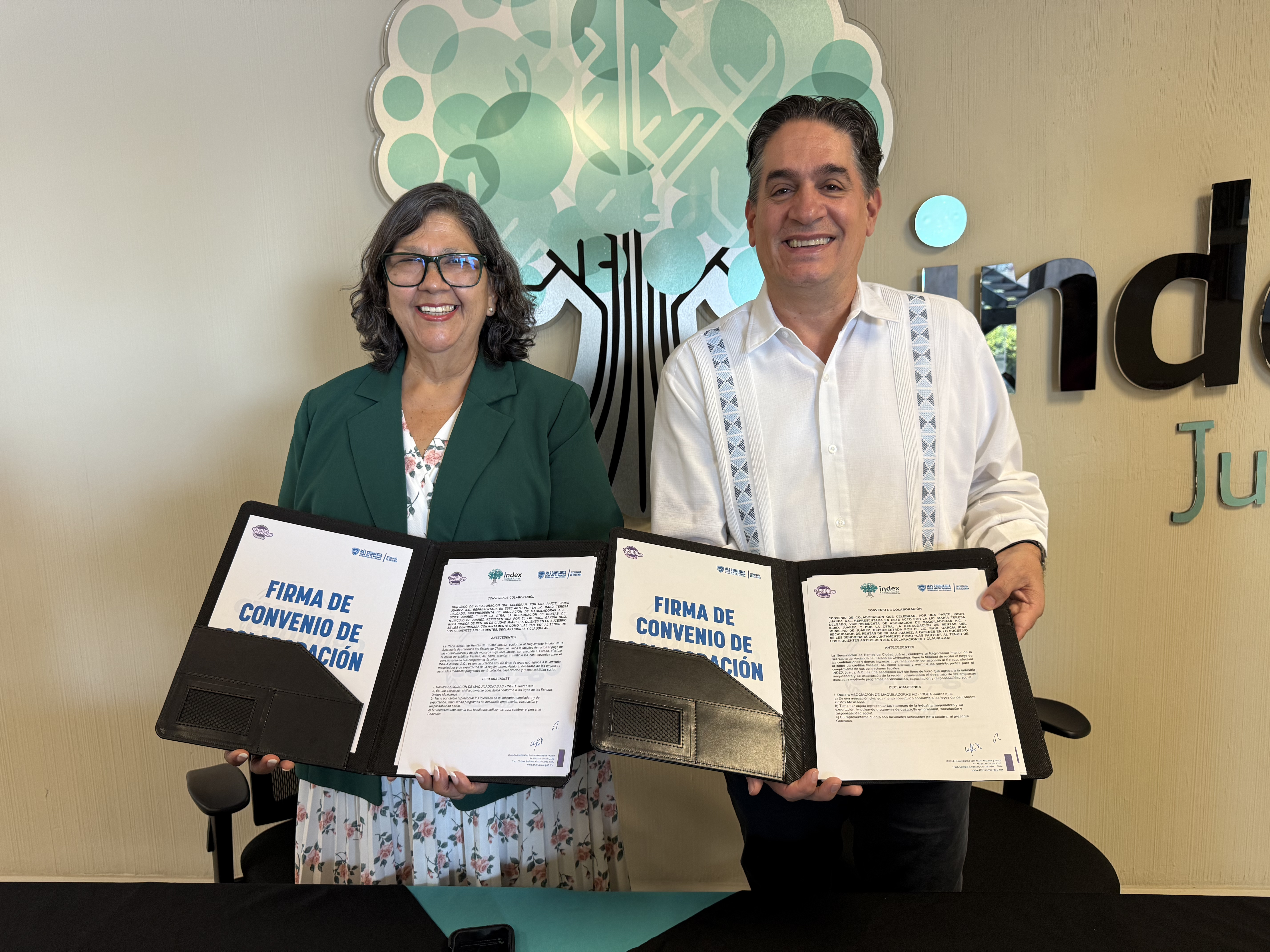 El acuerdo fue encabezado por Raúl García Ruiz, recaudador de Rentas en Ciudad Juárez, y María Teresa Delgado, vicepresidenta de Index Juárez, en las instalaciones del organismo empresarial.