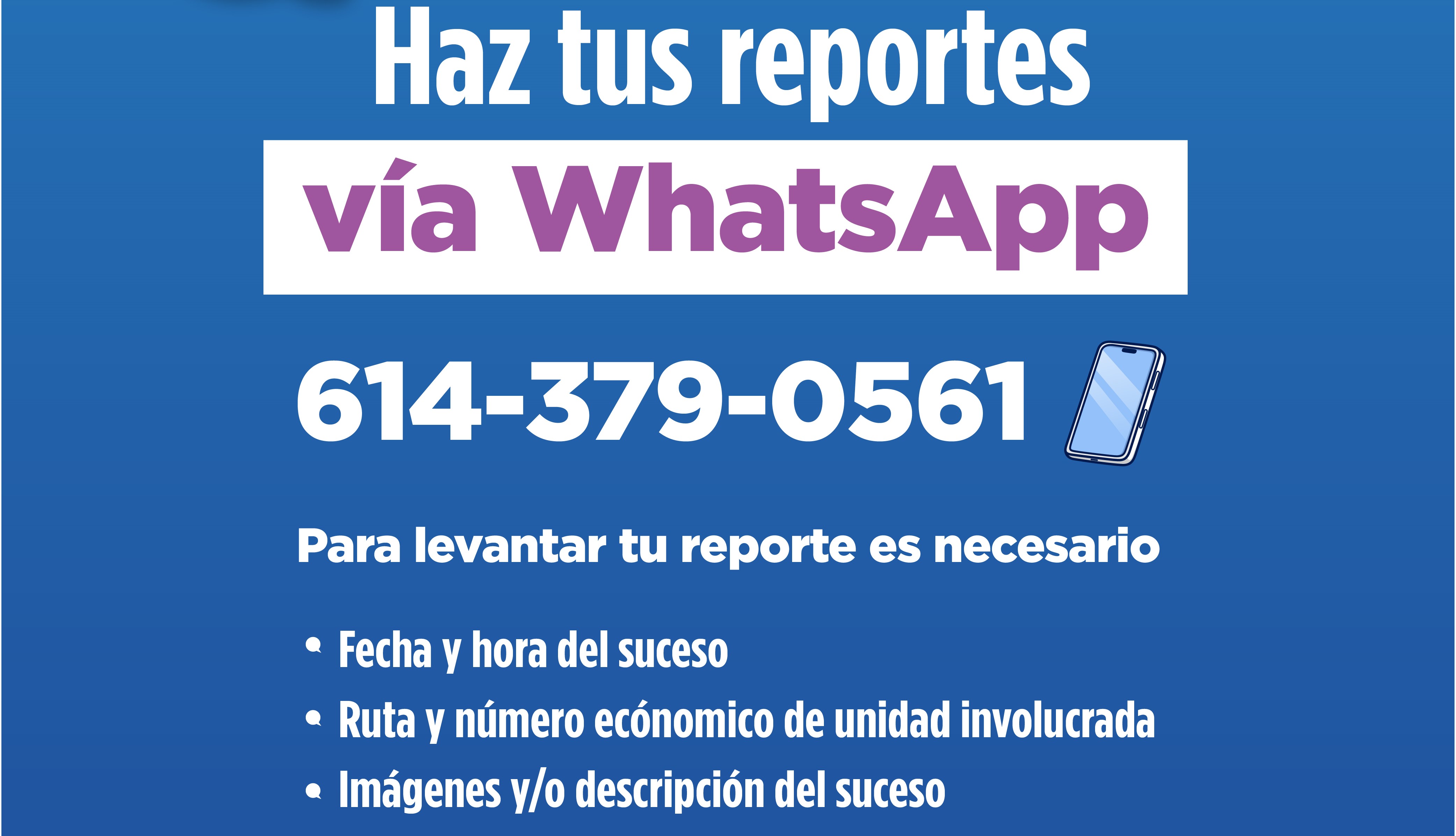 Las y los usuarios podrán enviar sus mensajes al número 614-379-0561, en los cuales deben incluir la ruta y número económico de la unidad, una descripción breve y clara de la incidencia, así como la fecha y hora del evento, a fin de recibir atención más eficiente y puntual.