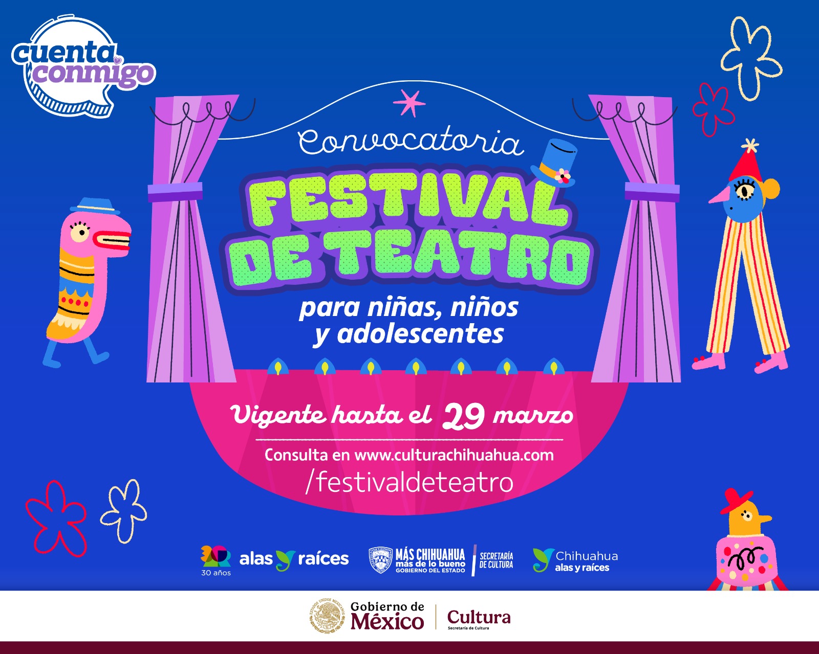 La Secretaría de Cultura, a través del programa “Alas y Raíces” Chihuahua invita a artistas, grupos, compañías de artes teatrales y musicales de Chihuahua, Juárez y Delicias, a participar en la integración de la agenda del Festival de Teatro para Niñas, Niños y Adolescentes.