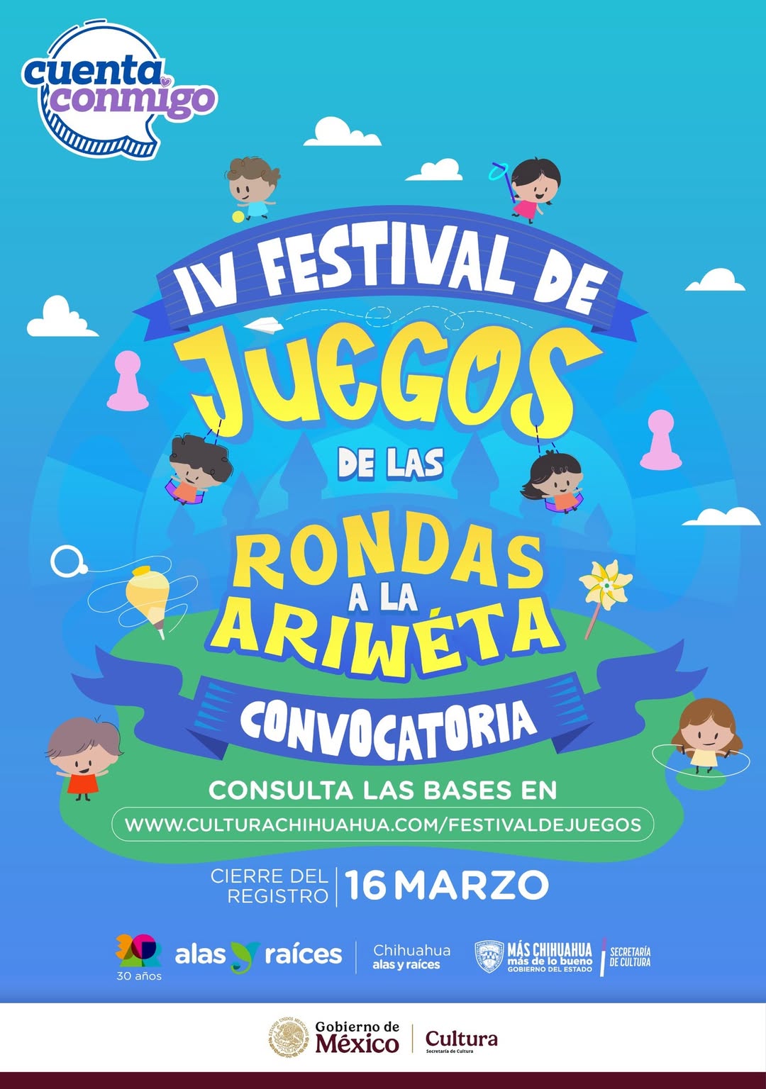 La Secretaría de Cultura, a través del programa “Alas y Raíces” Chihuahua, realizará la cuarta edición del Festival de Juegos “De las Rondas a la Ariwéta”, que llegará a los municipios de Chihuahua, Juárez, Hidalgo del Parral y Cuauhtémoc.
