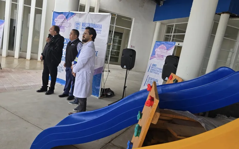 En coordinación con el Instituto Chihuahuense de Infraestructura Física Educativa (Ichife), también se integraron nuevos juegos infantiles, como resbaladillas y columpios, diseñados para impulsar la creatividad, la actividad física y el desarrollo psicomotor.