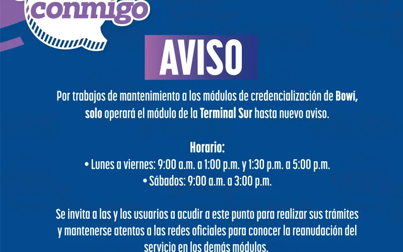 La Secretaría General de Gobierno, a través de la Operadora de Transporte (OTV) informa a las y los usuarios de Bowí, que, debido a trabajos de mantenimiento en el sistema, únicamente se brindará servicio en el módulo de credencialización de la Terminal Sur.