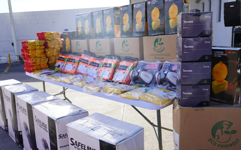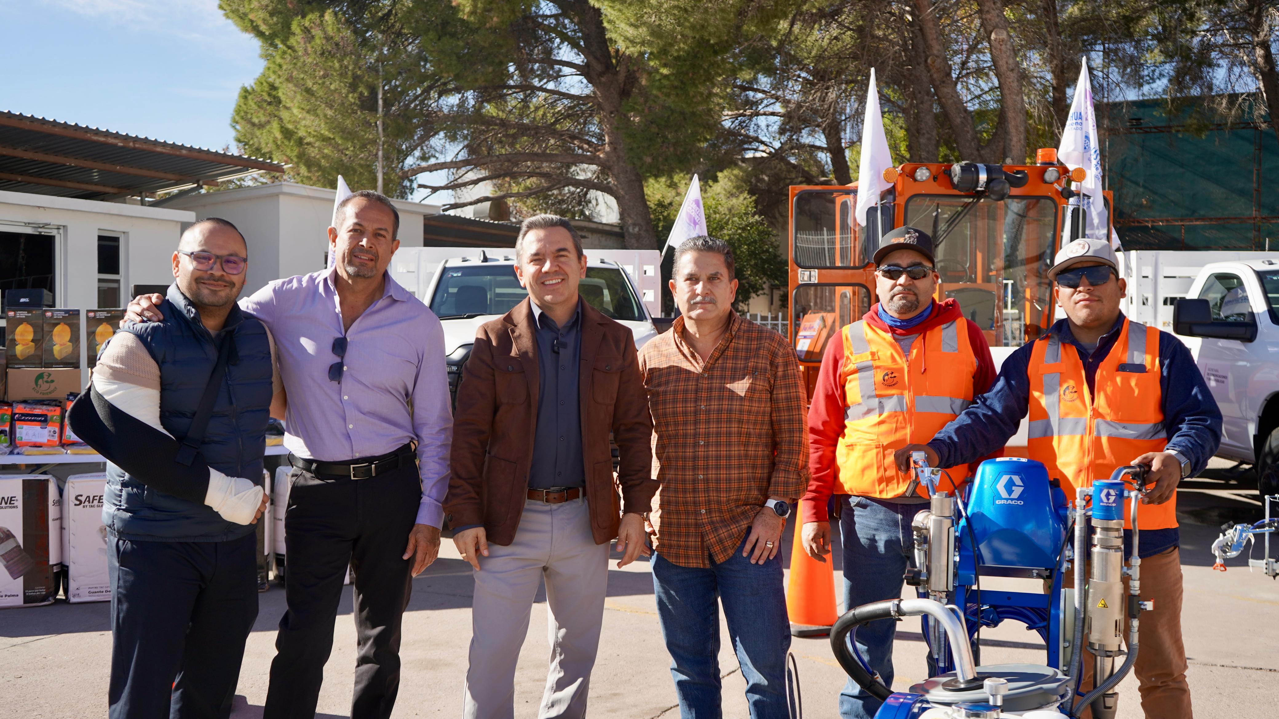 Lo proporcionado incluye tractores agrícolas, barredoras, pintarrayas y estacas, además de chalecos reflejantes, impermeables, guantes de carnaza, de piel y de operador, así como mascarillas de respirador y desechables, insumos necesarios para las tareas diarias.