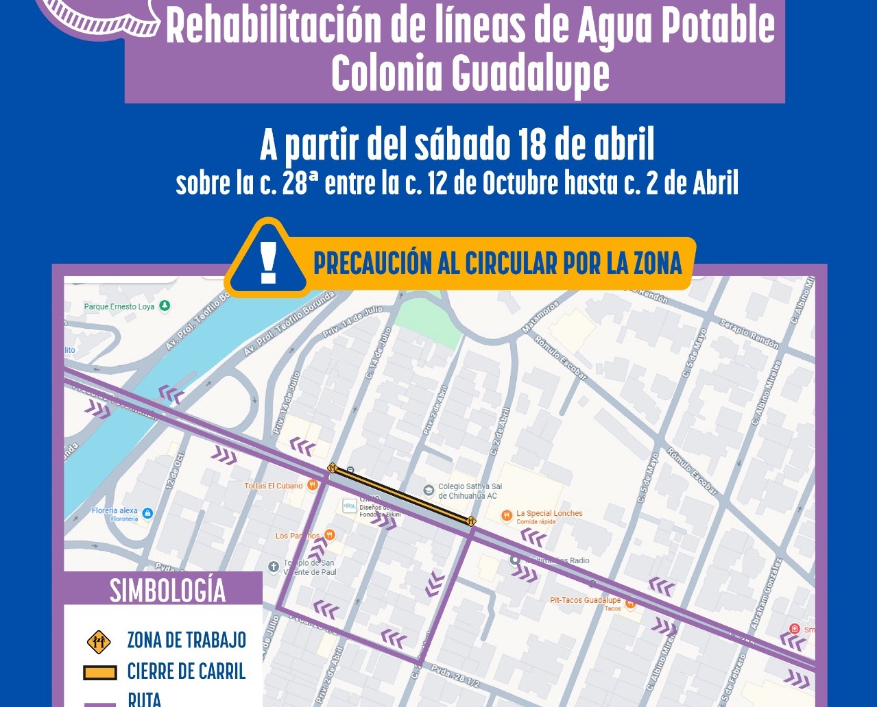 La Junta Municipal de Agua y Saneamiento (JMAS) de Chihuahua informa que este 18 de abril iniciará la rehabilitación de la línea de agua potable en la calle 28, entre 14 de Julio y 2 de Abril, en la colonia Guadalupe.