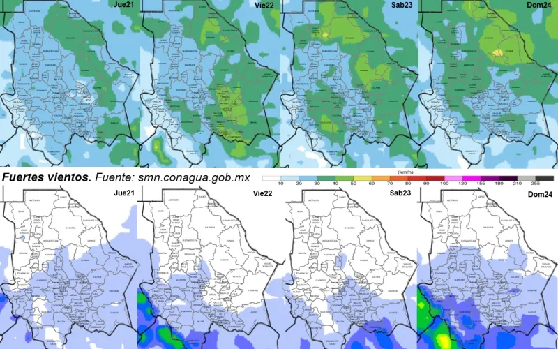 De igual manera, rebasarán los 35 km/h en Juárez, Práxedis G. Guerrero, Ascensión, Janos, Casas Grandes, Ocampo, Maguarichi, Bocoyna, Guachochi, Guadalupe y Calvo, Balleza, Nonoava, Chihuahua, Satevó, Valle de Zaragoza, Rosario, Huejotitán, San Francisco del Oro, Coyame, Ojinaga y Manuel Benavides.