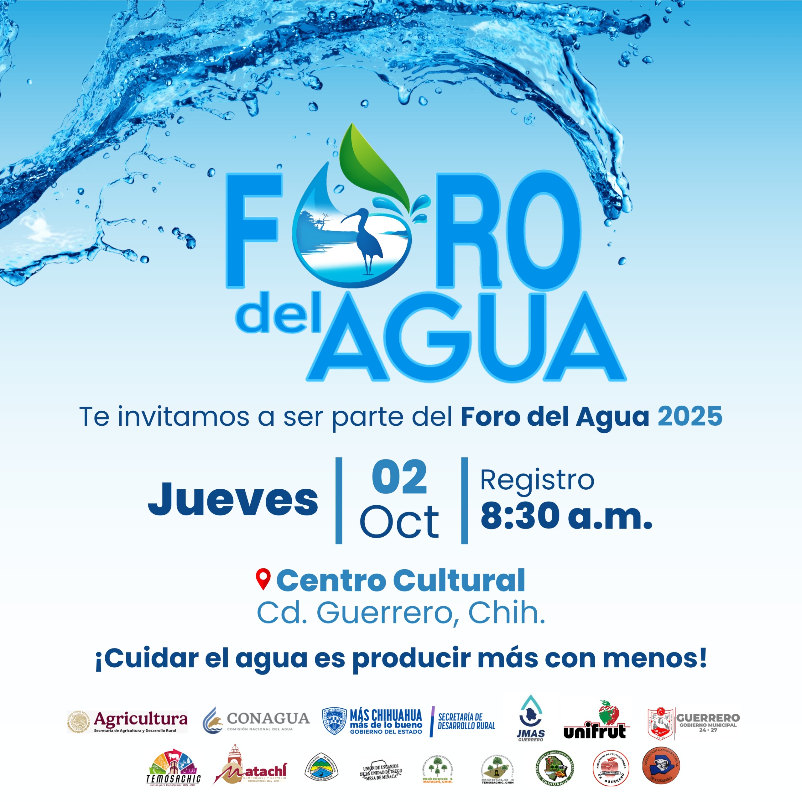 La Secretaría de Desarrollo Rural del Gobierno del Estado invita a productores, estudiantes y comunidad en general a participar en el Foro del Agua 2025, que se celebrará el próximo 2 de octubre en el Centro Cultural de Ciudad Guerrero, a partir de las 08:30 horas.